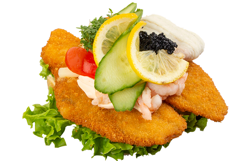 Stjerneskud med kogt og stegte fiskefileter, rejer, asparges, stenbidderrogn og diverse pynt.